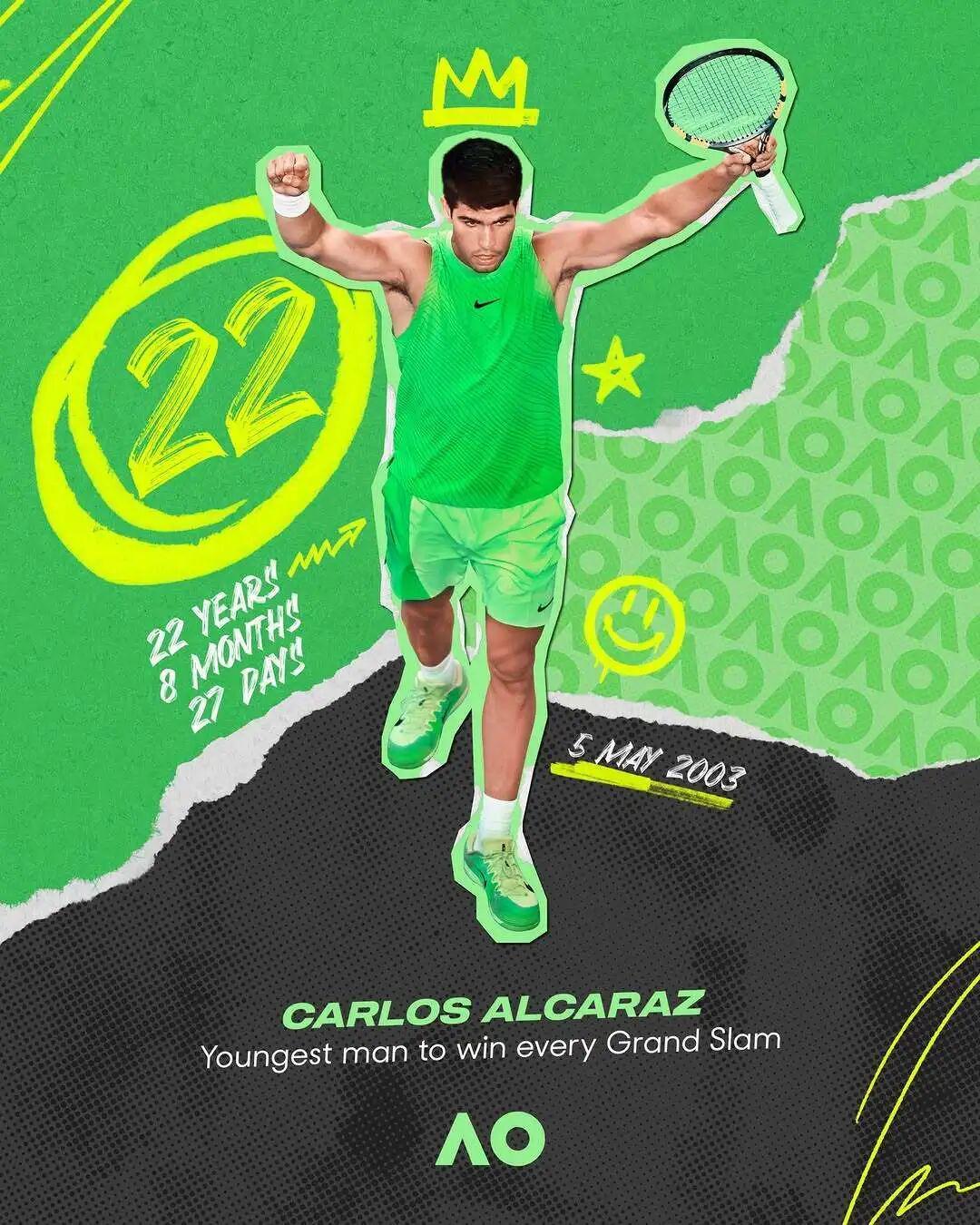 22岁零272天,2026年澳大利亚网球公开赛,罗德拉沃尔球场,阿尔卡拉斯成为网球历史上第九位赢得全部四大满贯赛事的男子选手,同时也是史上最年轻的全满贯选手。